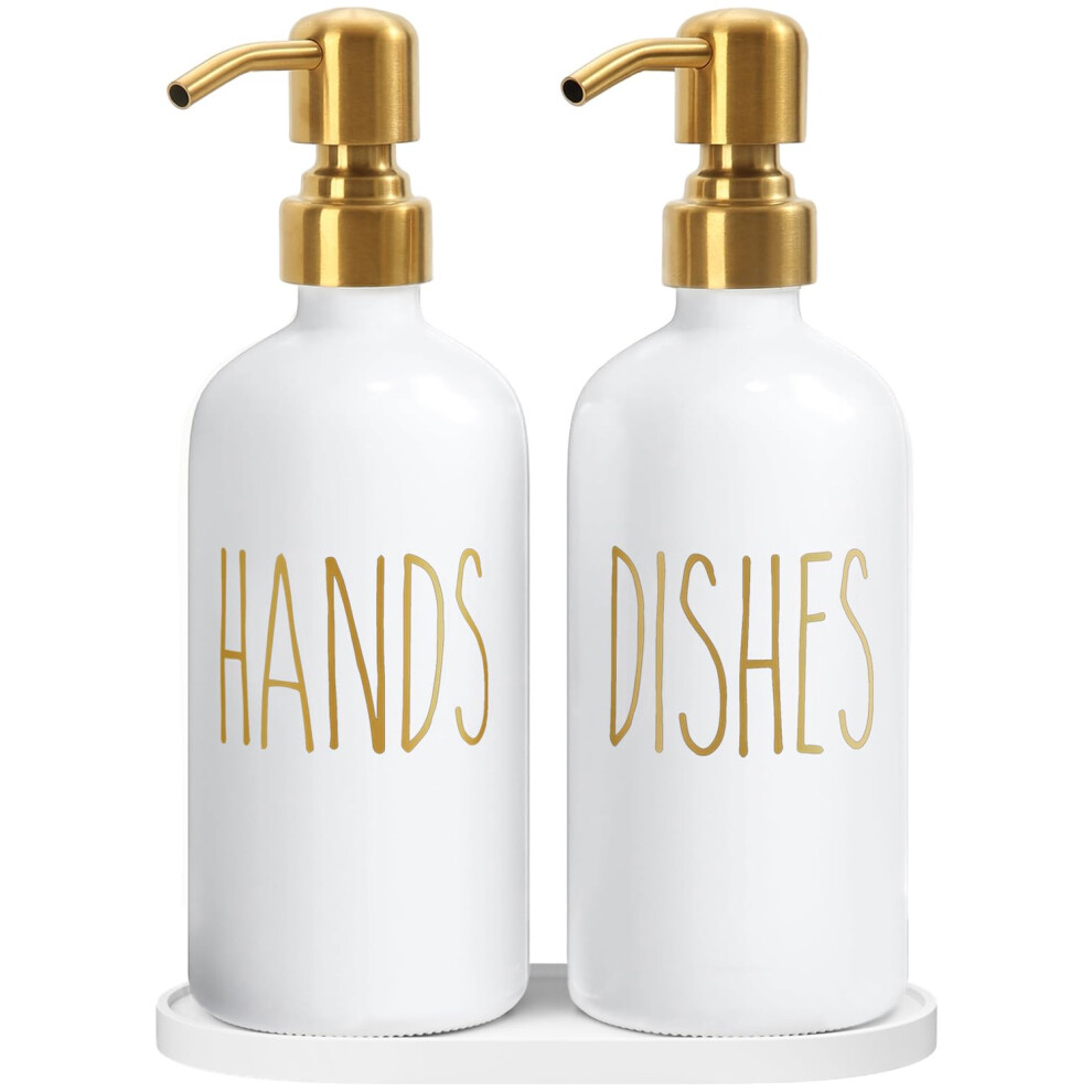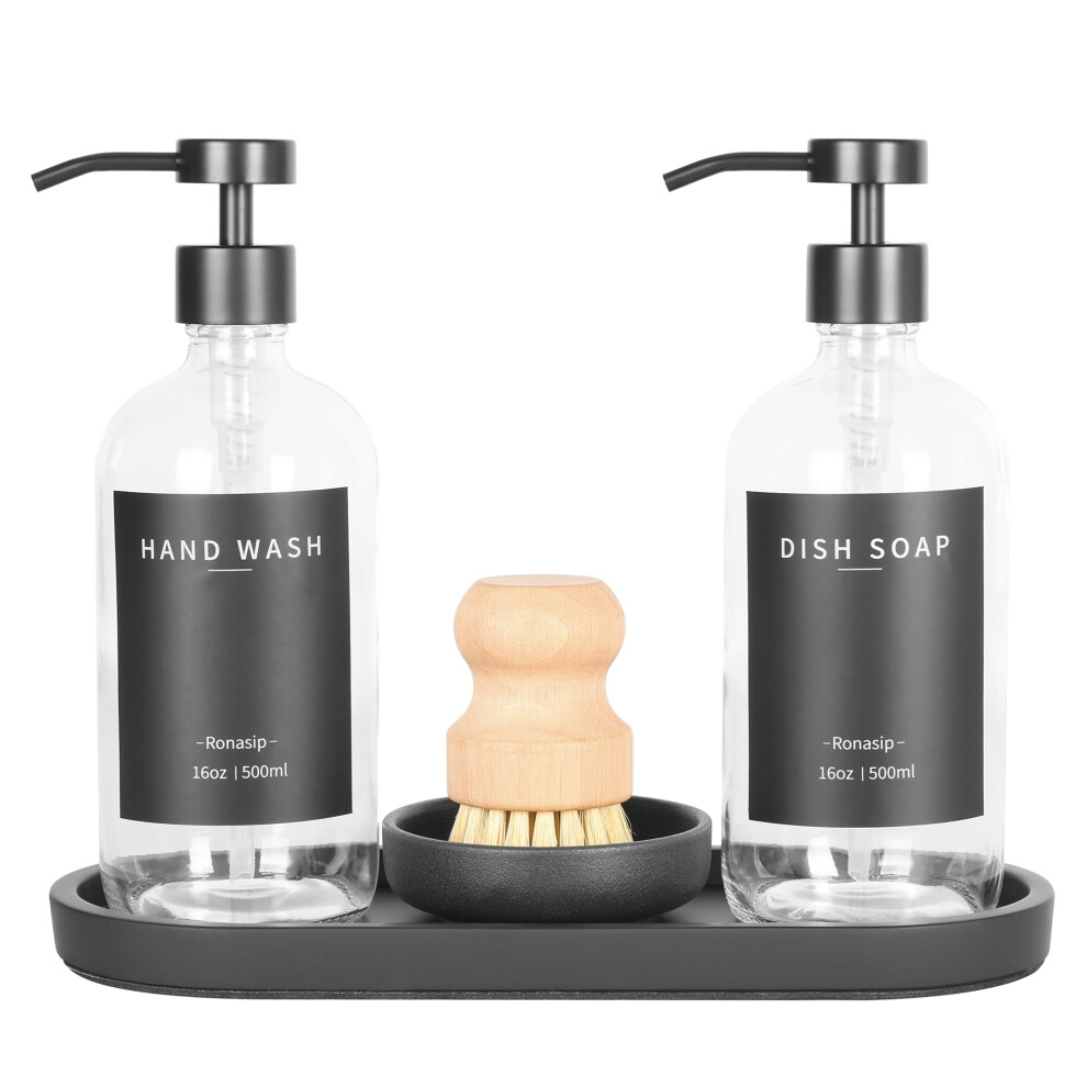 Luxspire Kitchen Soap Dispenser Set - 17oz Hand and Dish Soap Dispenser Set with Fast Drying Tray, Glass Bottle with Waterproof Labels, Kitchen Sink