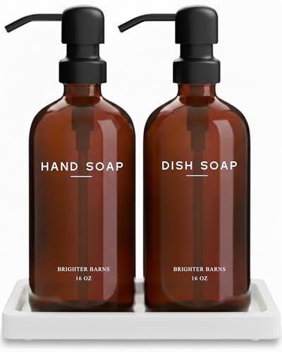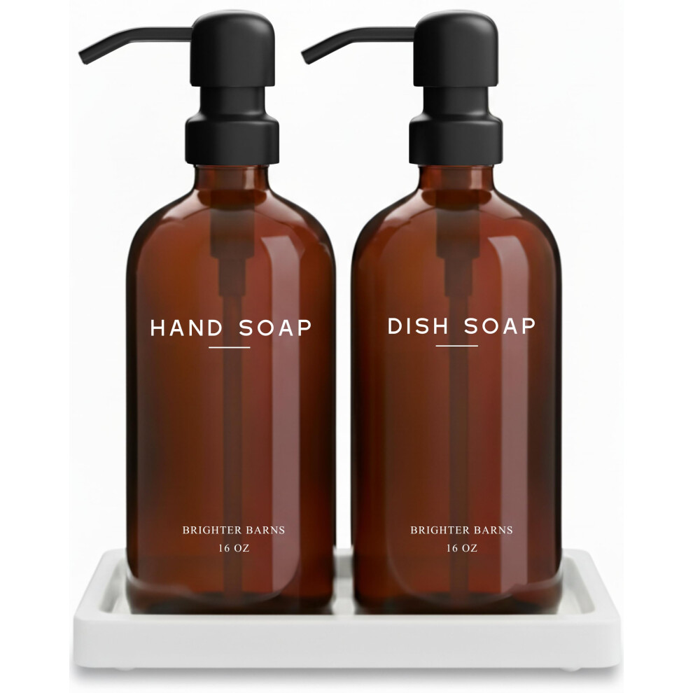 Amber Glass Hand and Dish Soap Dispenser Set by Brighter Barns - Kitchen Soap Dispenser Set with Tray - Farmhouse Soap Dispenser for Kitchen Sink -
