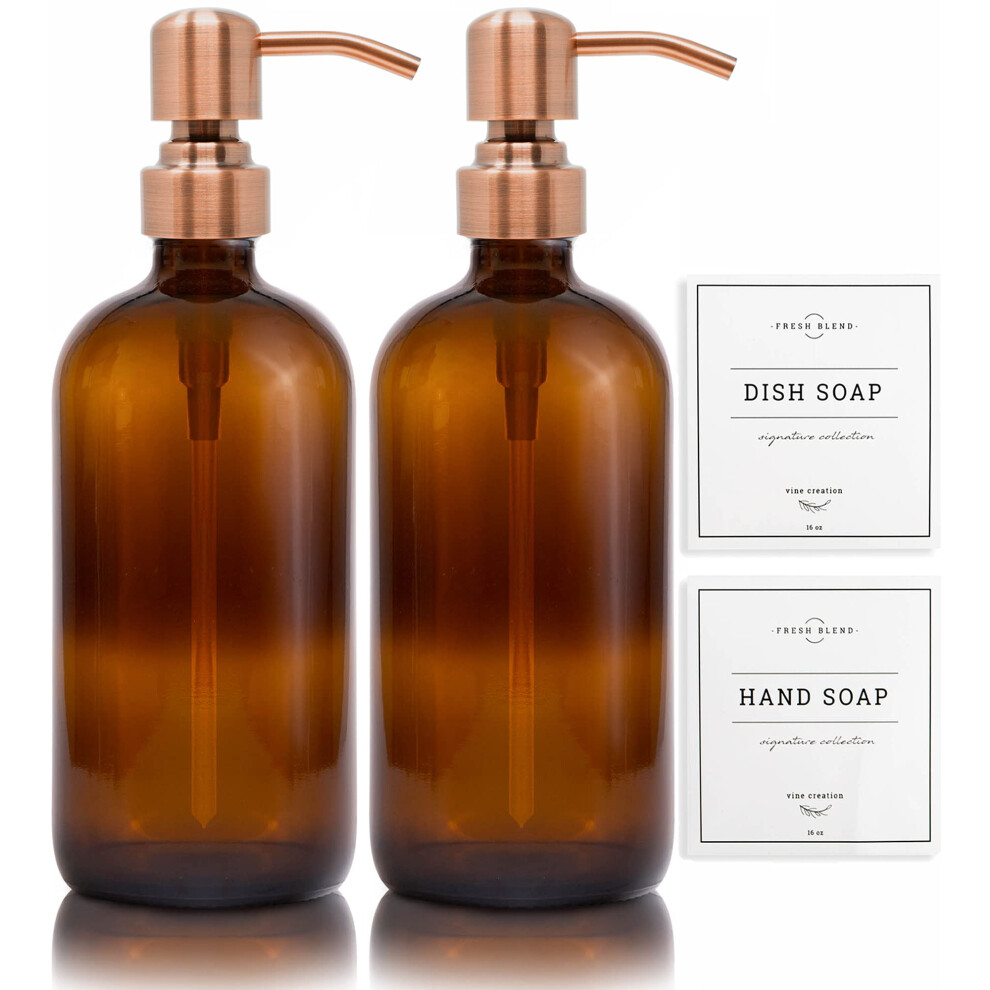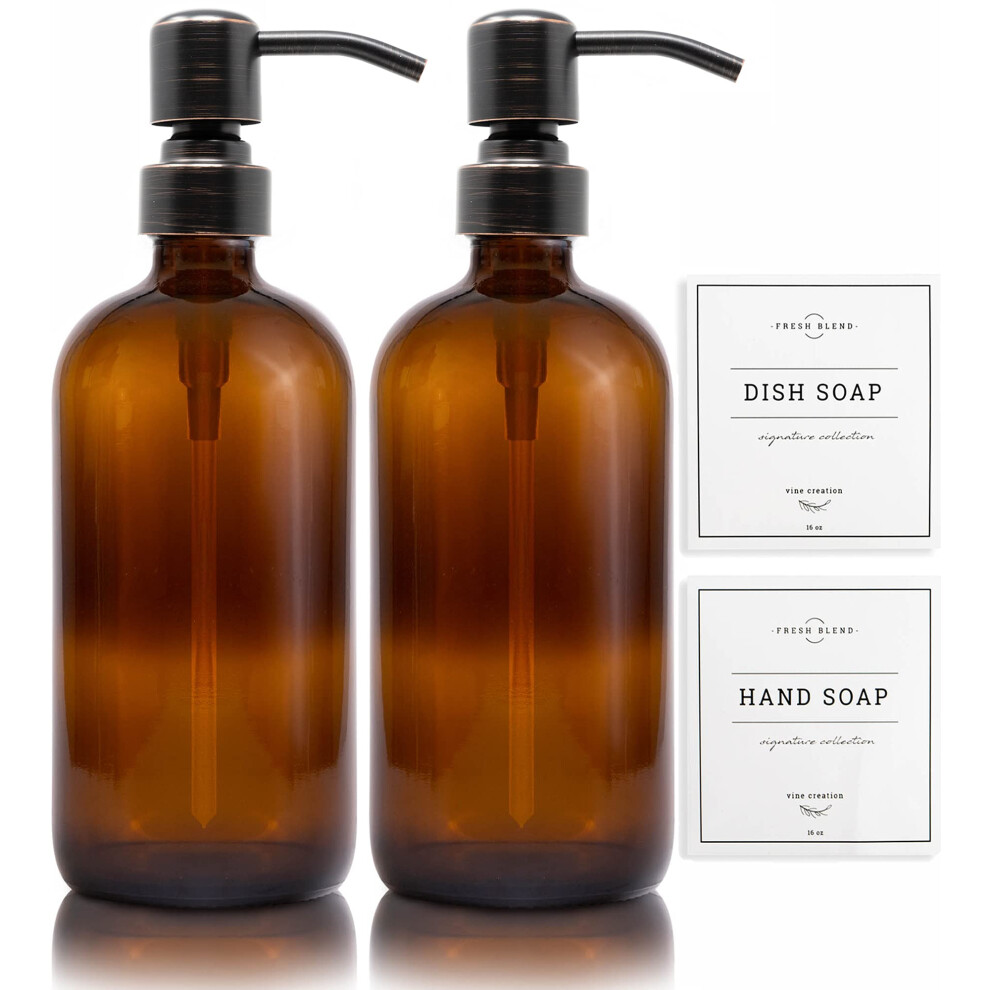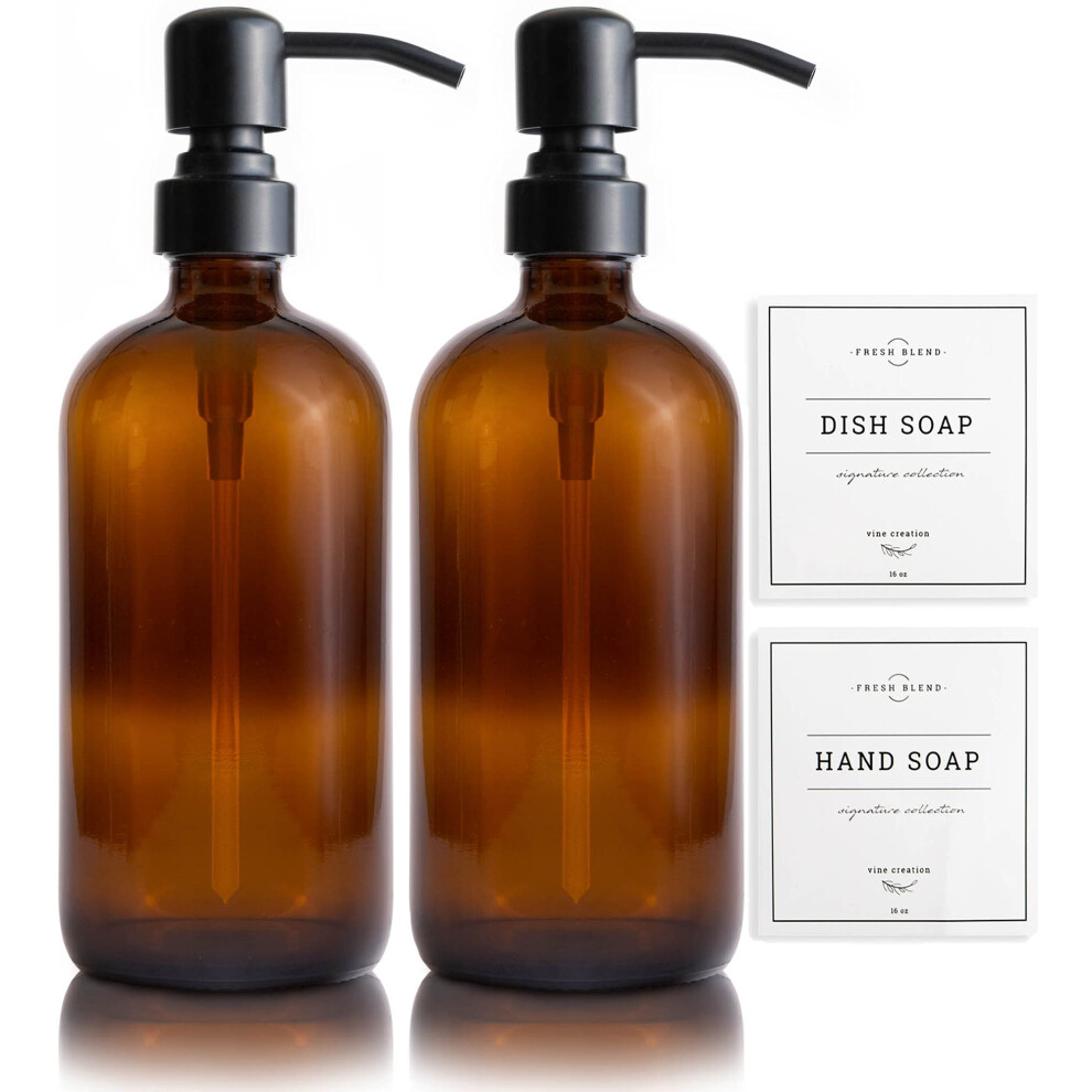 Vine Creations Amber Glass Soap Dispenser, 2 Pack Kitchen Soap Dispenser Set with Stainless Steel Pump, 16 oz Dish Soap and Hand Soap Dispensers for Bathroom with Waterproof Labels