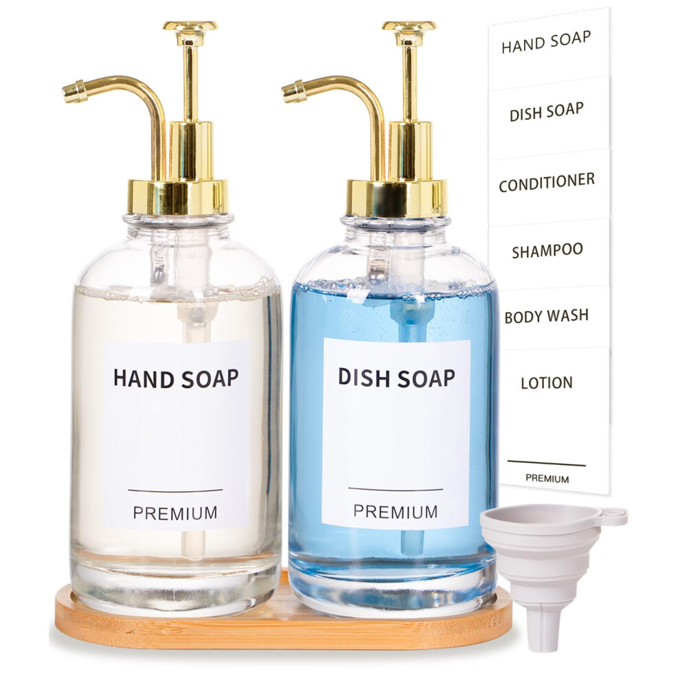Dish Soap Dispenser for Kitchen Hand Glass Soap Dispenser Set with Pump Tray Funnel for Bathroom Shower Laundry Liquid Lotion (Gold 2 Pack