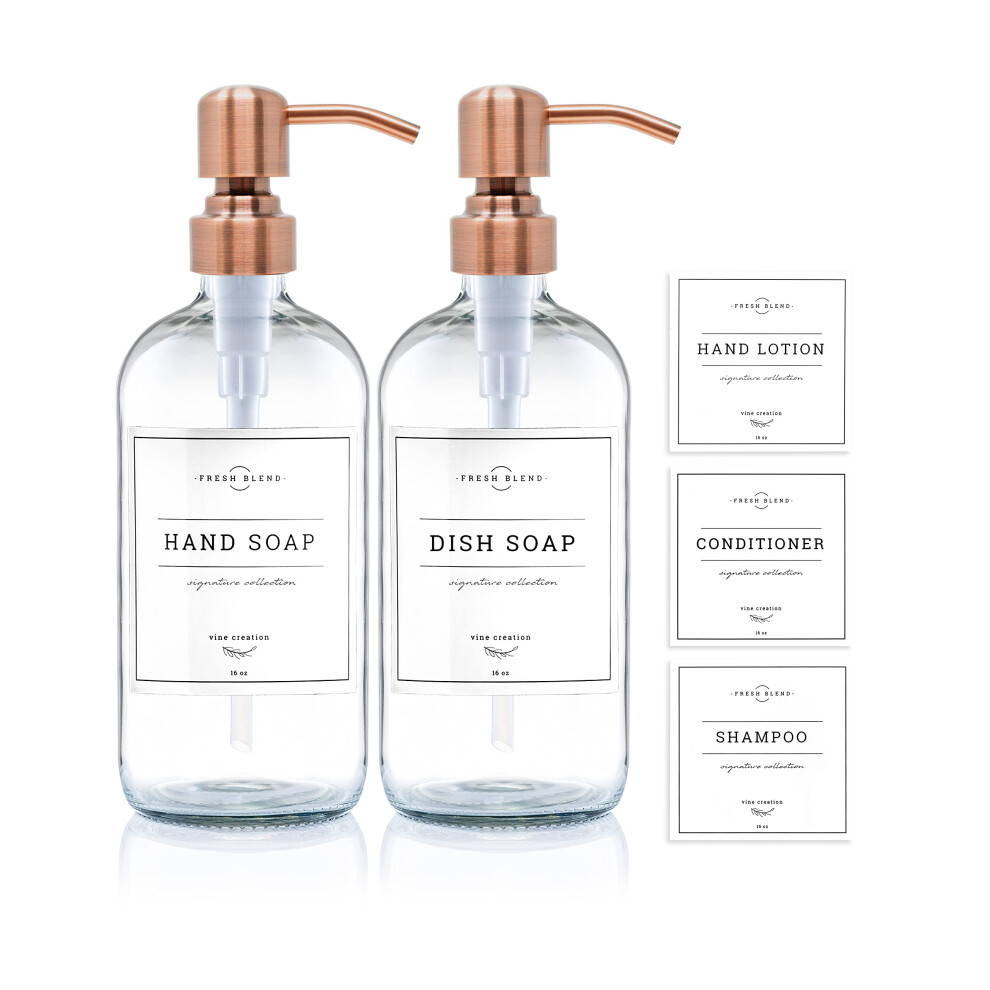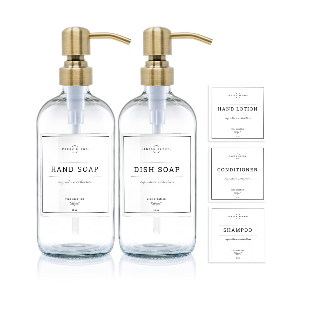 Vine Creations Clear Glass Soap Dispenser, 2 Pack Kitchen Soap Dispenser Set with Stainless Steel Pump, 16 oz Hand Soap or Dish Soap for Bathroom or Kitchen with Waterproof Labels