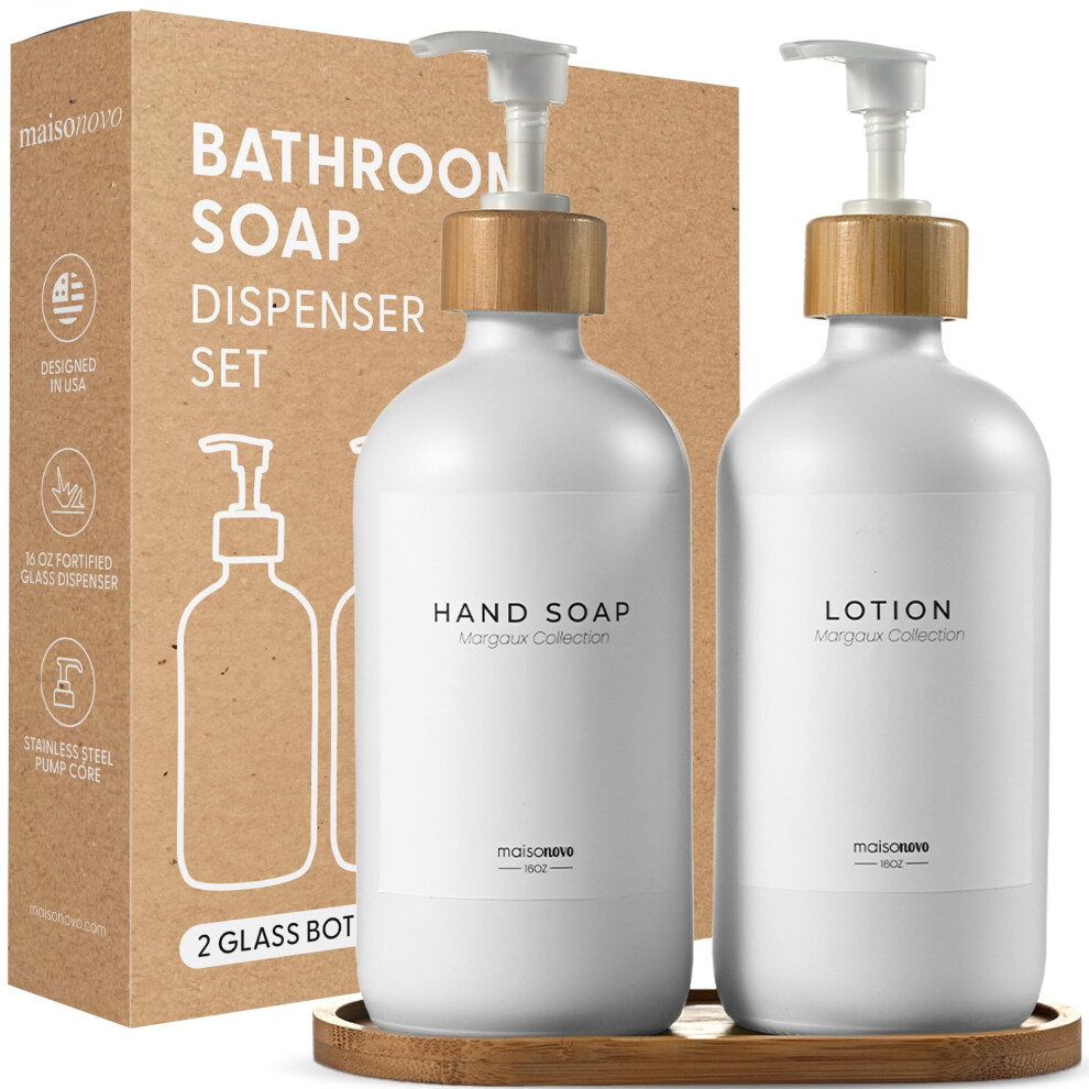 MaisoNovo Kitchen Soap Dispenser Set - Glass Soap Dispenser with Pump - White Bamboo White Pump 16.9 fl oz - Bathroom Soap Dispenser Set of 2 - Soap