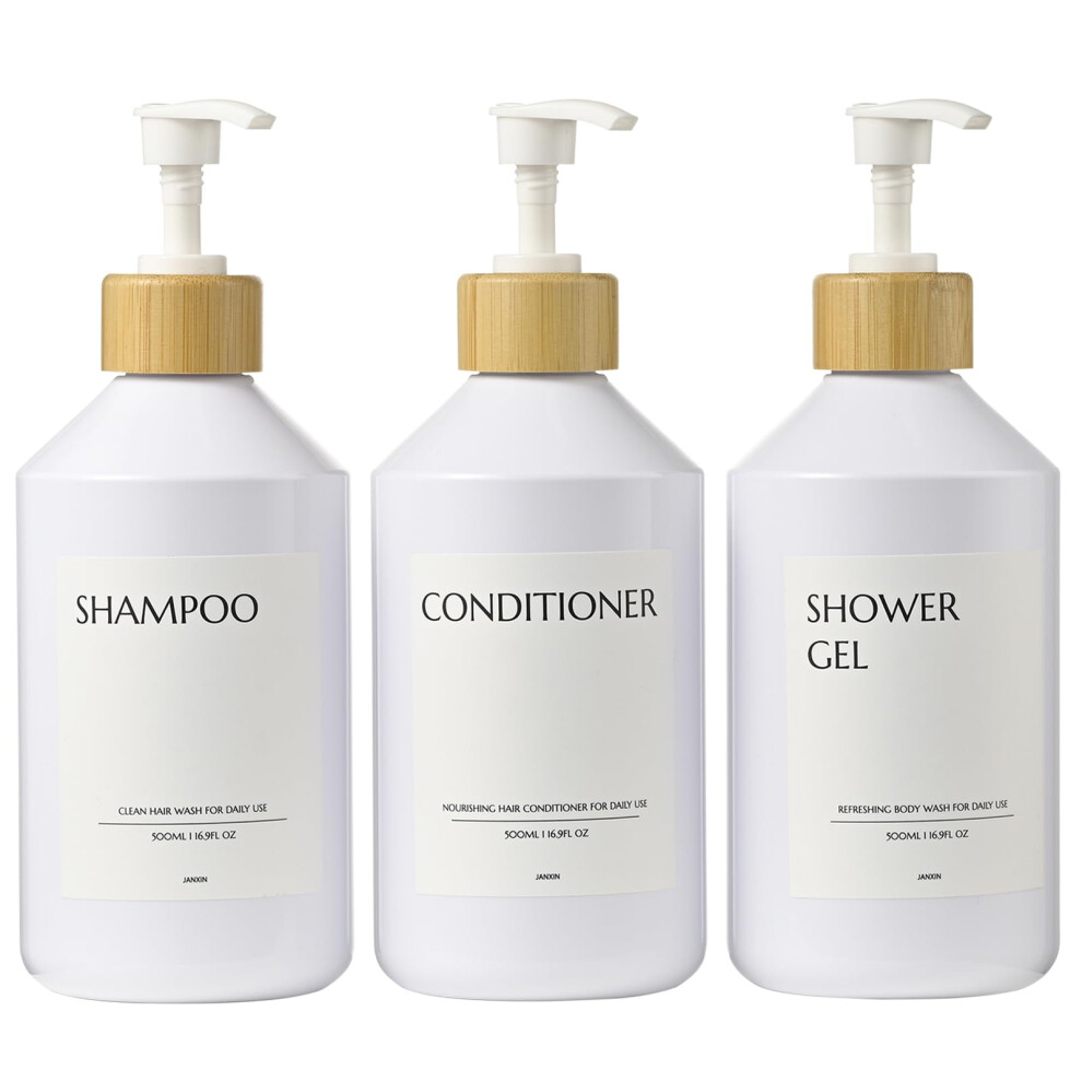 Janxin Refillable Shampoo and Conditioner Bottles, Shampoo Bottles with Pump, Pump Bottle, Dish Soap Dispenser with Labels, Kitchen Soap Dispenser Set