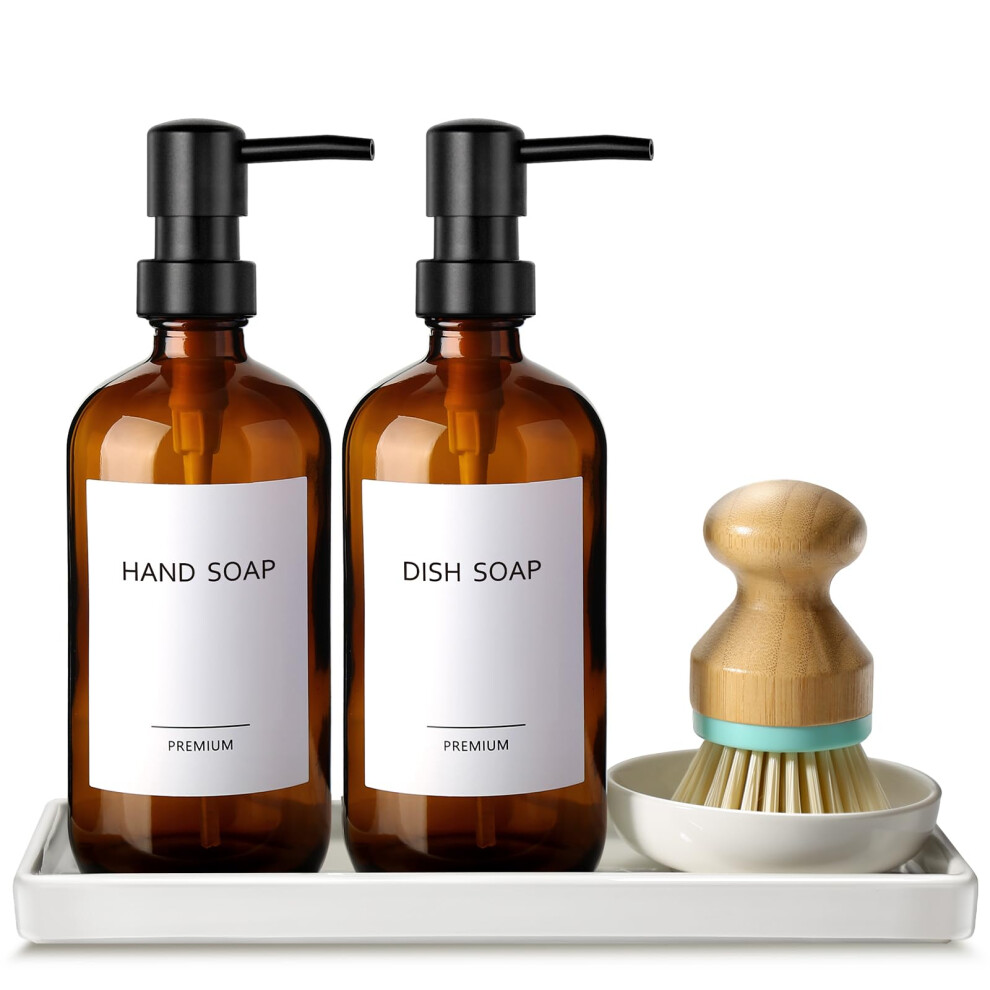 Maisonovo Kitchen Soap Dispenser Set | Hand and Dish Soap Dispenser Set with Handmade Ceramic Vanitry Tray and 16 Waterproof Labels | Amber Glass