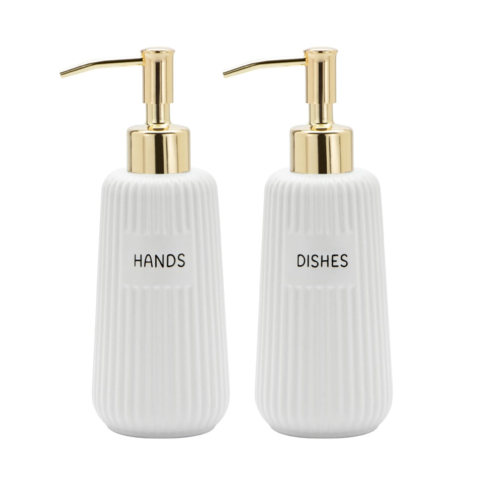 Karisky Kitchen Soap Dispenser Set with Gold Stainless Steel Pump and Funnel, Modern Ceramic Refillable Hand and Dish Soap Dispenser Set for Kitchen,