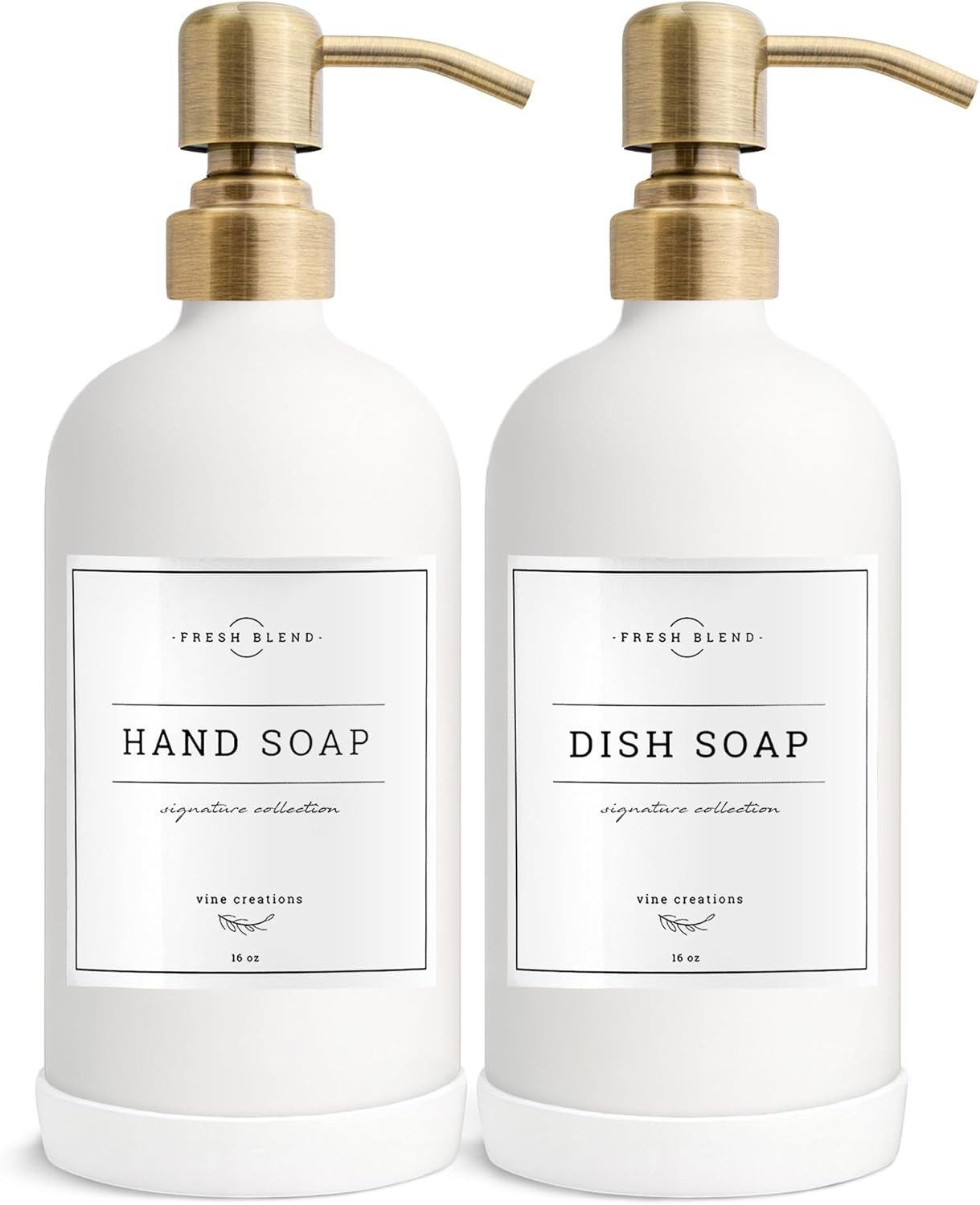 Vine Creations White Glass Soap Dispenser, 2 Pack Kitchen Soap Dispenser Set with Stainless Steel Pump, 16 oz Dish Soap and Hand Soap Dispensers for Bathroom with Waterproof Labels