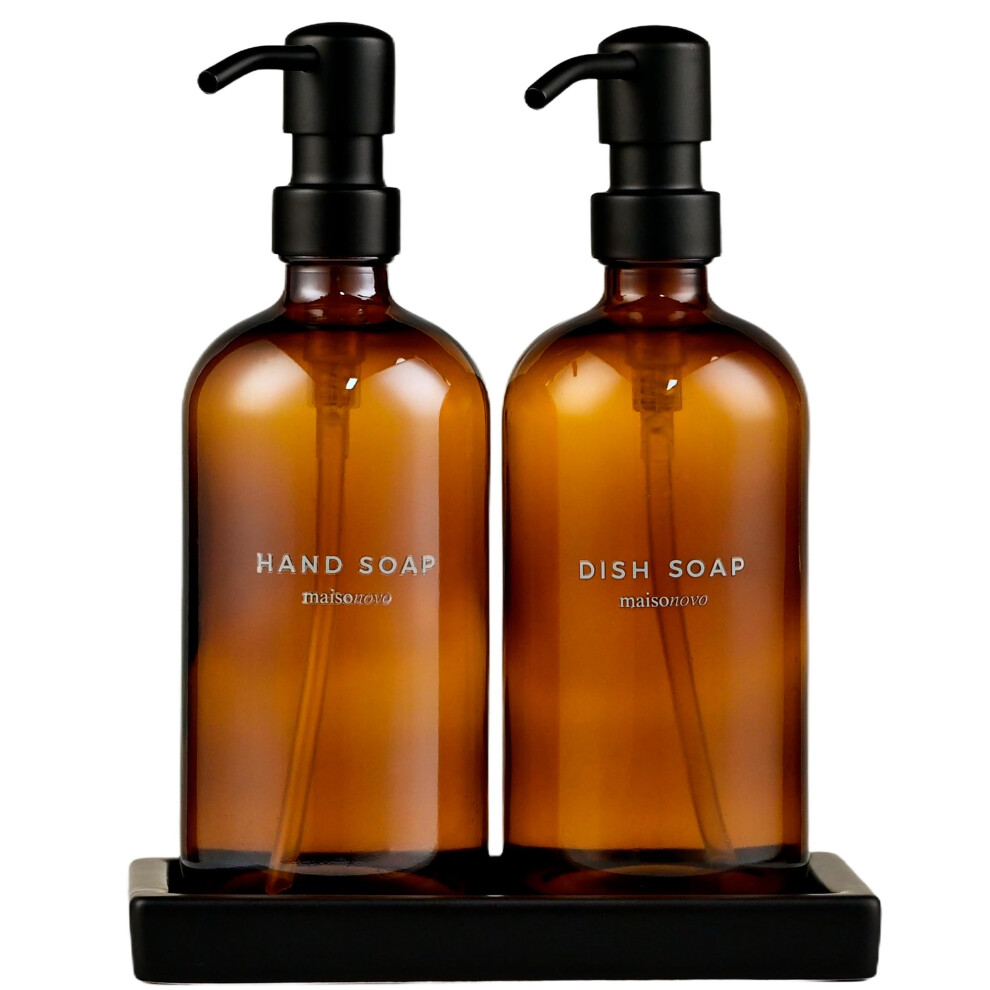 MaisoNovo Kitchen Soap Dispenser Set with Tray | Bamboo Plastic Amber Set x 2