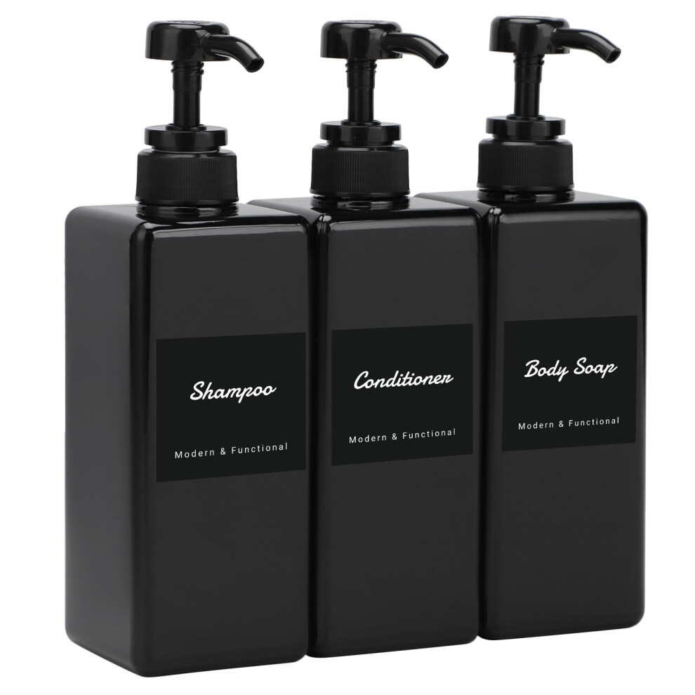 Segus Black Soap Dispenser, 3 Pieces 650ml Shower Gel Dispenser, Hand Wash Dispenser in Plastic, Shampoo Bottles with Pump, Kitchen Soap Dispenser Set