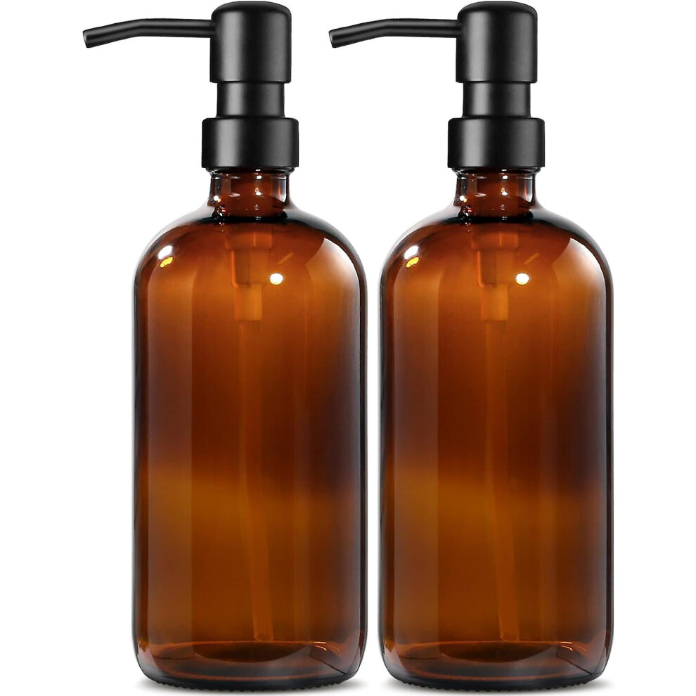 (As show, One size) Amber Glass Soap Dispenser with Smooth Stainless Steel Pump, 500ml, Refillable Kitchen Soap Dispenser - Set of 2