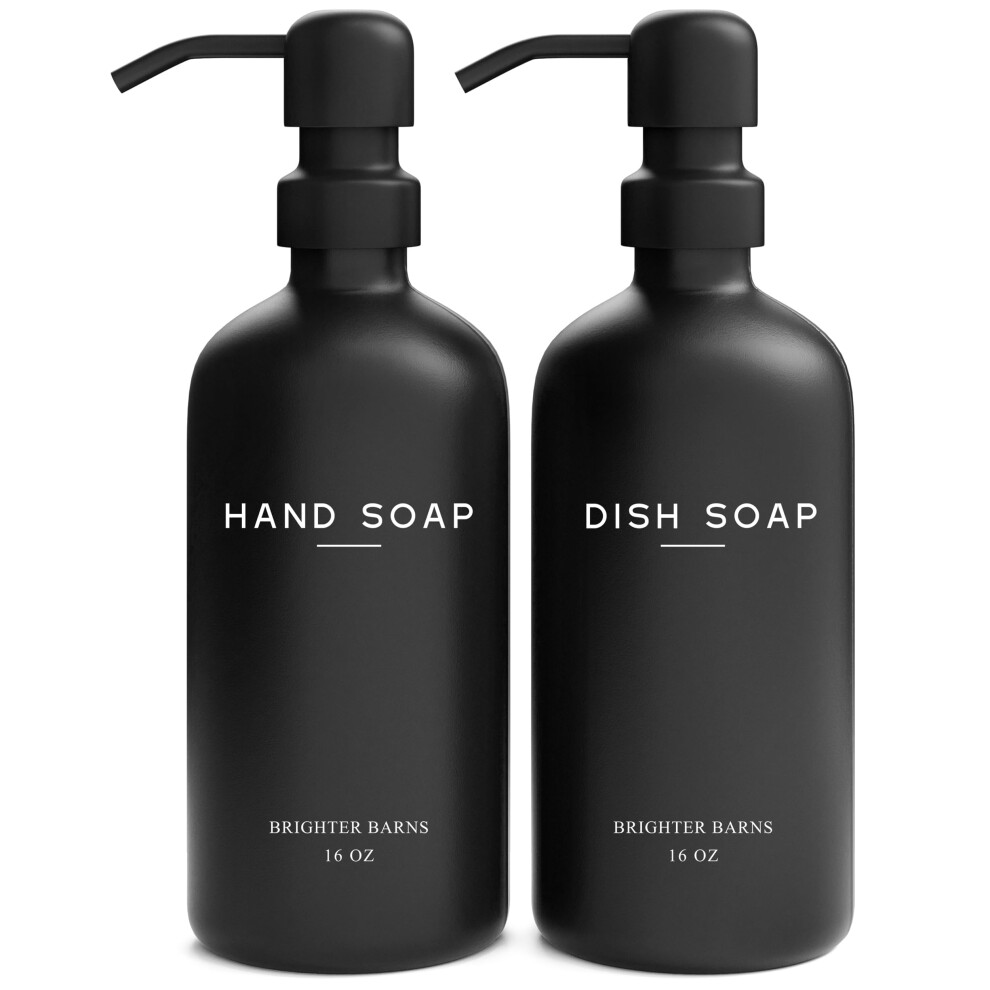 Black Glass Soap Dispenser Set by Brighter Barns - Hand and Dish Soap Dispenser for Kitchen Sink - Kitchen Soap Dispenser Set & Pump - Farmhouse Kitchen Decor, Bathroom Decor & Accessories (Black)