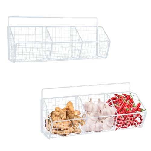 Gzsekken Wall-Mounted Hanging Kitchen Storage Baskets,Metal Storage Baskets with 3 Sections Wire Shelf No Drilling Adhesive Storage Basket Organiser Rack for Shower Kitchen,White-2pack