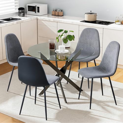 GOLDFAN Dining Table and Chairs Set 4 Modern Glass Round Kitchen Table with 4 Fabric Chairs with Metal Legs (Grey)