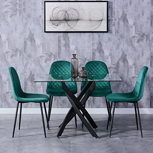 GOLDFAN Modern Tempered Glass Dining Table and Chairs Set 4 Rectangular Kitchen Table and Velvet Chairs Dining Room Sets,Green/120CM