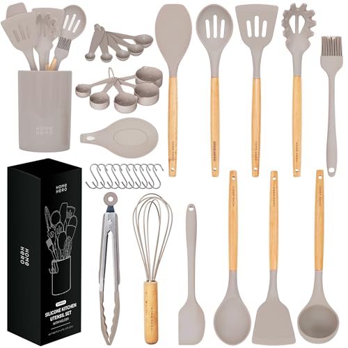 Kitchen Utensils Set - 33 pcs Non-Stick Heat Resistant Cooking Utensils Set - Spoons Turners Spatula Ladle Set - Kitchen Tools Gadgets Accessories Silicone Set - Stone