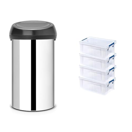 Brabantia 60 Litre Large Kitchen Touch Bin (Brilliant Steel/Matt Black Lid) Removable Lid & BANKERS BOX 4x 10L Plastic Storage Boxes with Lids. ProStore Super Strong Stackable Plastic Storage Boxes