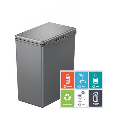 EKO Morandi 30L Kitchen Recycling Bin with Touch-Top Lid, Slim Plastic Rubbish Bin with Recycling Stickers and Easy-Clean Finish, Compact Design for Home or Office, Dark Grey