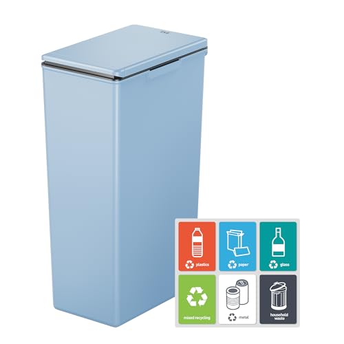 EKO Morandi 40L Kitchen Recycling Bin with Touch-Top Lid, Slim Plastic Rubbish Bin with Recycling Stickers and Easy-Clean Finish, Compact Design for Home or Office, Titanium Blue