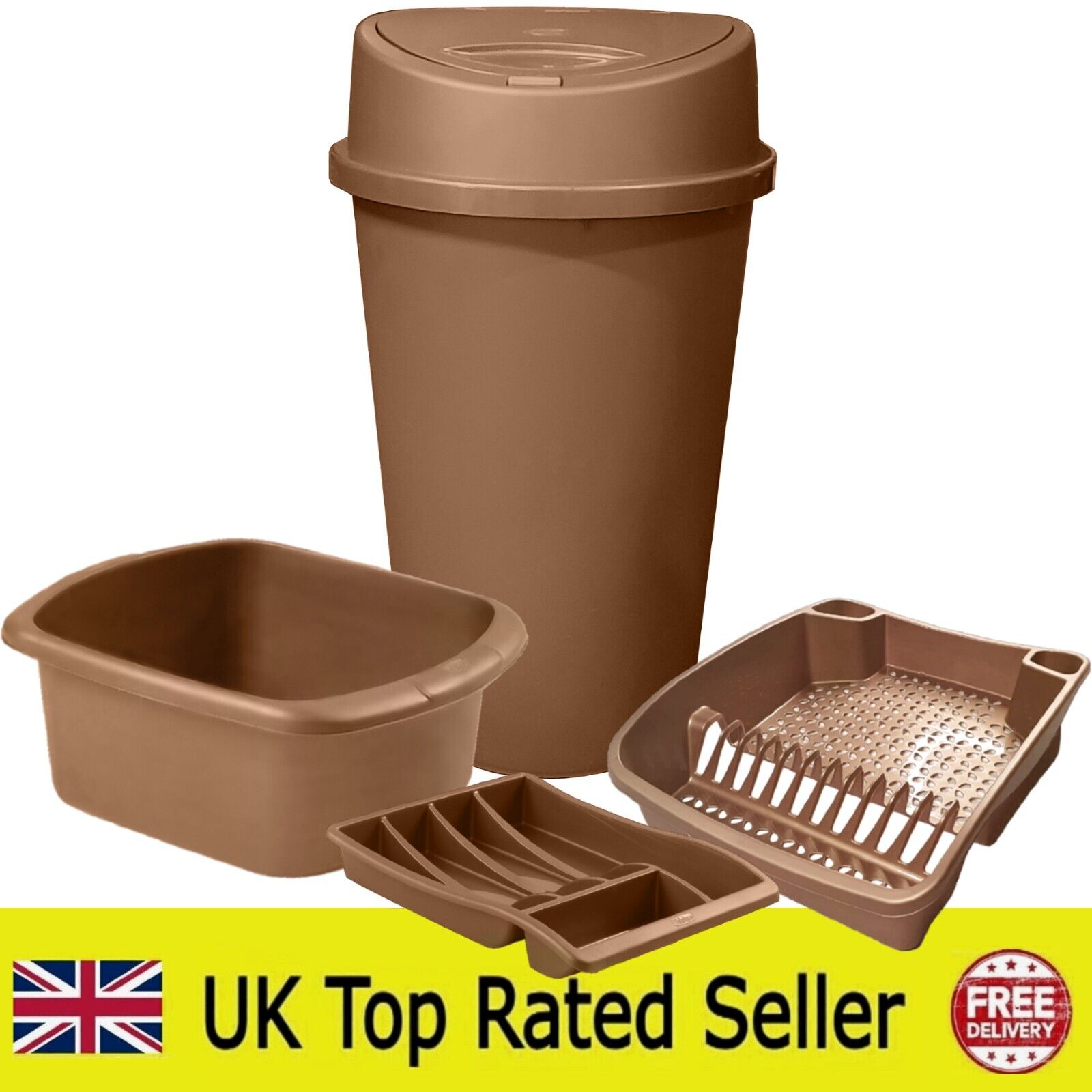 Rose Gold Kitchen Bin 4 Piece Set - Touch Top Bin Bowl Drainer Cutlery Tray