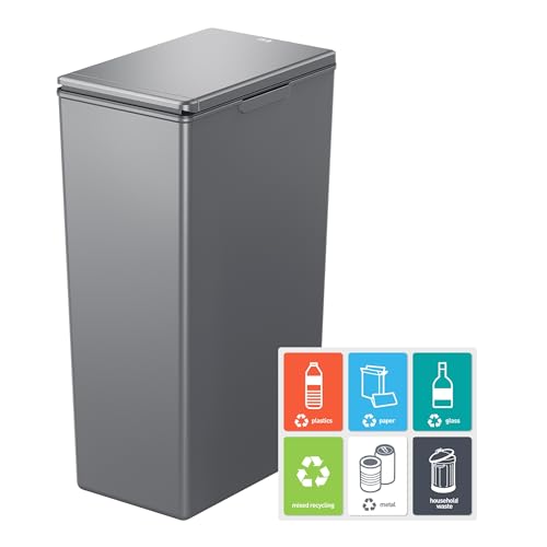 EKO Morandi 40L Kitchen Recycling Bin with Touch-Top Lid, Slim Plastic Rubbish Bin with Recycling Stickers and Easy-Clean Finish, Compact Design for Home or Office, Dark Grey