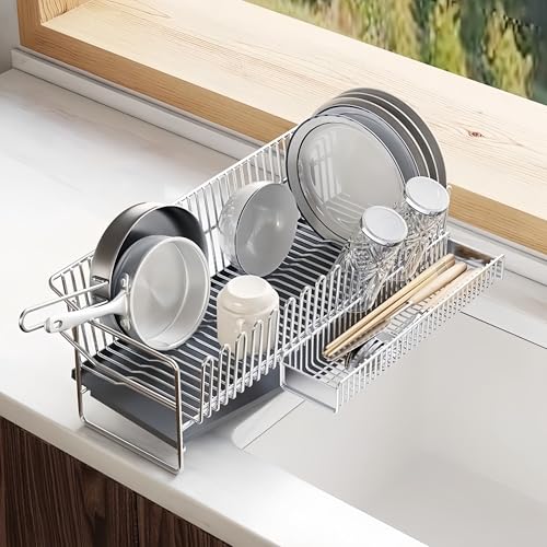 Extendable Stainless Steel Dish Rack with Draining Board, Cutlery Holder for Various Kitchen Utensils And Chopstick Holder – Multifunctional Dish Rack for the Kitchen Worktop