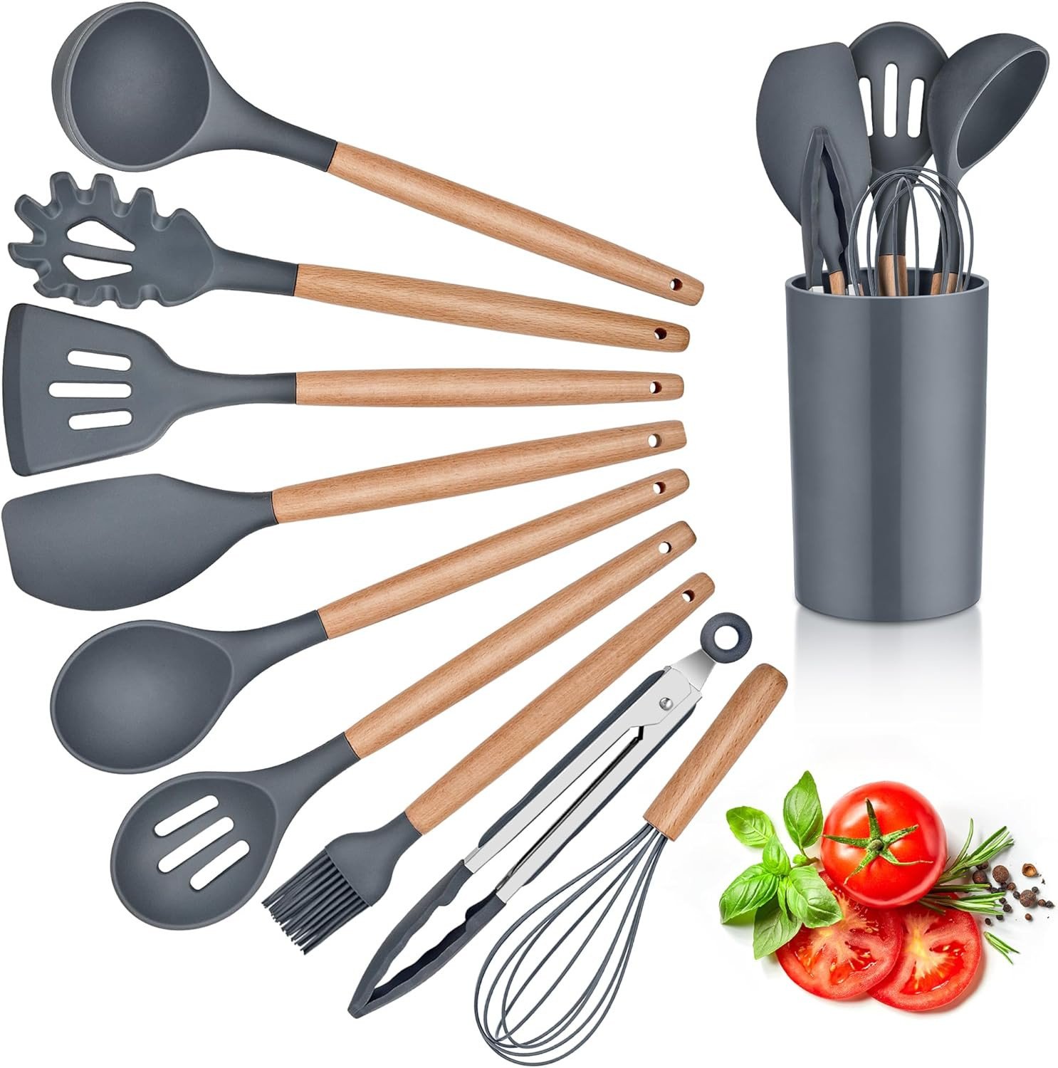 Lychee 12pcs Silicone Cooking Kitchen Utensils Set with Holder, Nonstick Cookware,Heat Resistant Wooden Handles Cooking Tool, BPA Free Non Toxic Tongs Spatula Spoon Kitchen Gadgets Set (Grey)