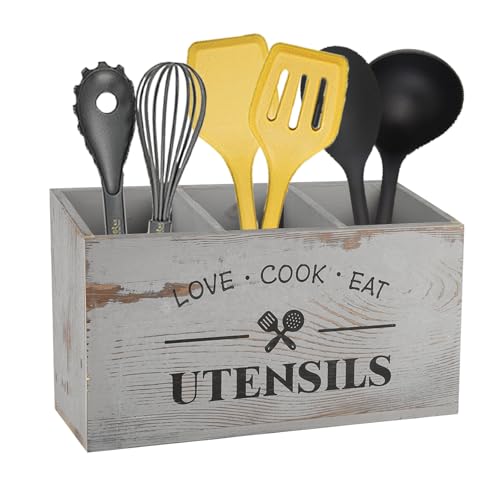 Kitchen Utensils Holder, Kitchen Cooking Utensil Organizer with 4 Compartment and Drainage Bottom, Farmhouse Utensil Organiser Cutlery Caddy , Wooden Cooking Tools Storage for Countertop (Black)
