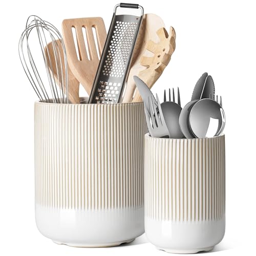 LE TAUCI Utensil Holder, 18.5+14cm Ceramic Kitchen Utensils Holder, Large Cooking Utensil Pots for Kitchen Counter, Morden Utensil Organizer for Spatula, Set of 2, White