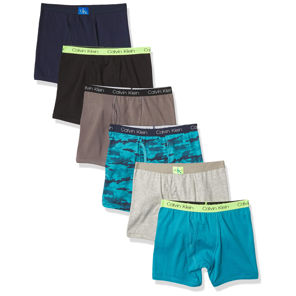 Calvin Klein Kids Boys' Modern Cotton Boxer Brief Underwear 6-Pack, Castlerock Grey/Moon Blue/Black Iris/Camo/Heather Grey/Black, Medium