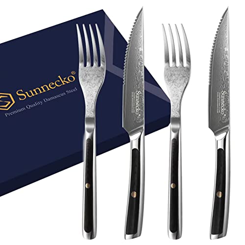 Sunnecko Damascus Steak Knife and Fork Set of 4, Damascus Steel VG-10 Serrated Knives, Steak Knife Set with G10 Handle Tableware Cutlery Set