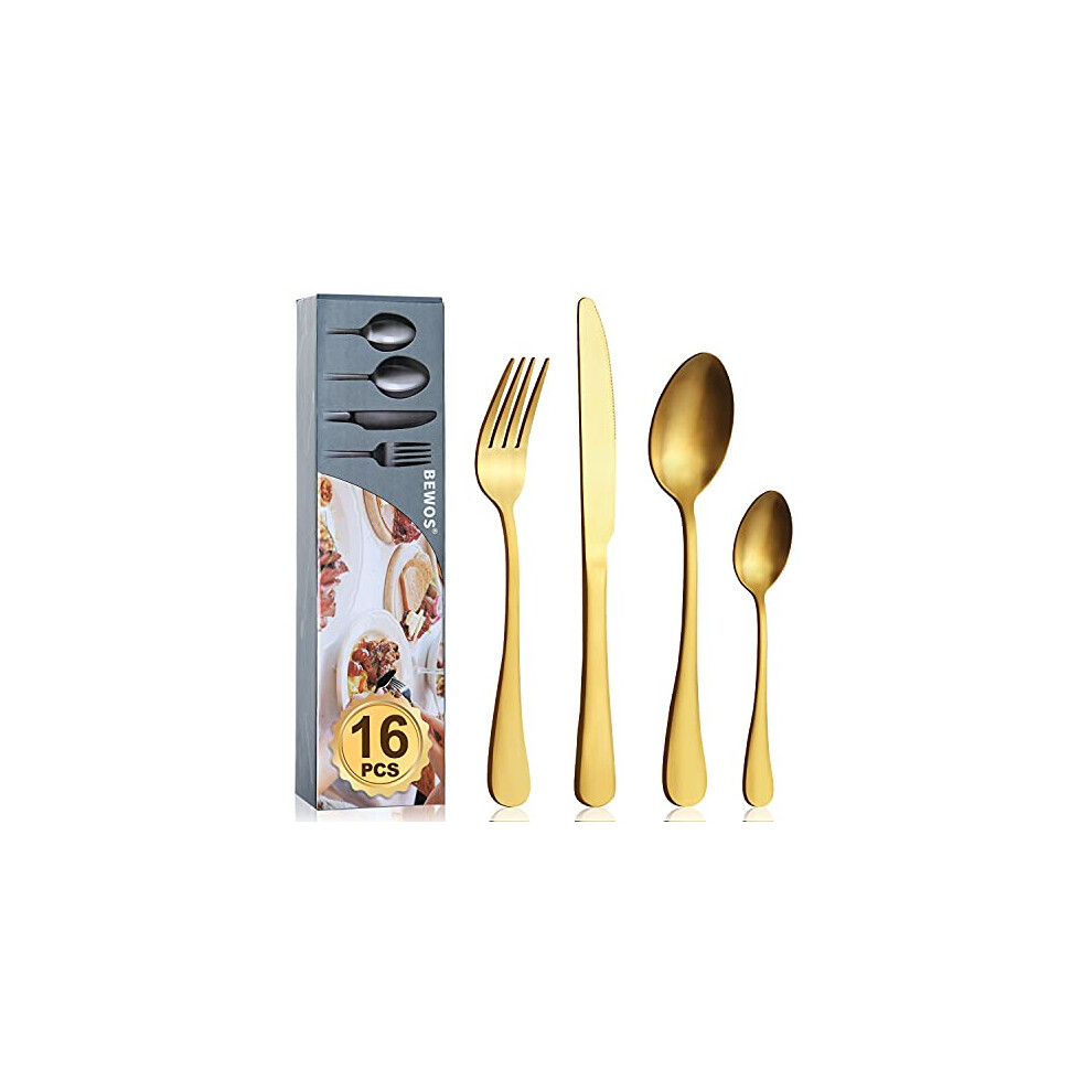 Cutlery Set, BEWOS 16-Piece Stainless Steel Matt Gold Flatware Set, Tableware Silverware Set with Spoon Knife and Fork Set, Service for 4, Dishwasher