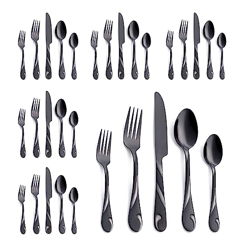 Seeshine 30 Piece Black Stainless Steel Cutlery Set for 6 People, 6 Sets of 5 Piece Flatware, Includes Knife, Fork, Spoon, Dishwasher Safe