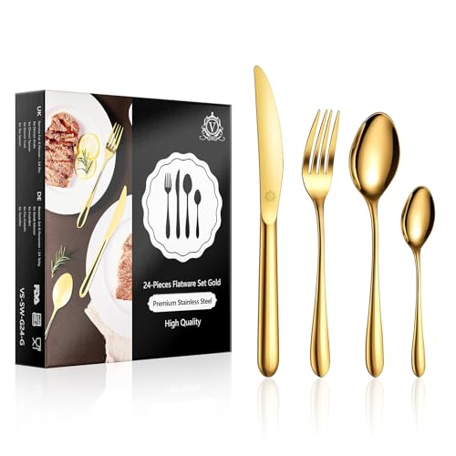 vancasso Gold Cutlery Set for 6 People,24 Piece Food-Grade Knife and Fork Sets, Mirror Polished Silverware, Include 6 Knives/6 Spoons/6 Tea Spoon, Gift Package for Wedding Housewarming