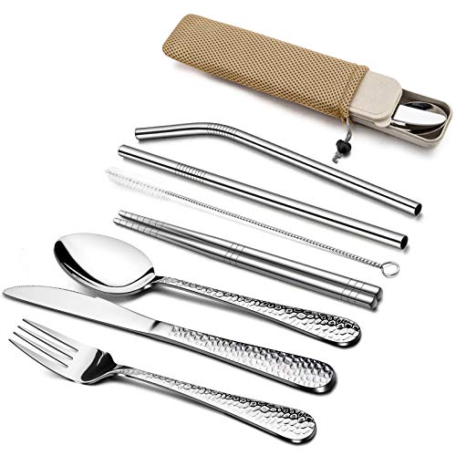 HaWare 9 Piece Portable Hammered Cutlery Sets, Stainless Steel Camping Flatware for 1, Travel Utensils Including Knife, Fork, Spoon, Chopsticks, Cleaning Brush, Straws, Portable Case & Bag (Wheat)