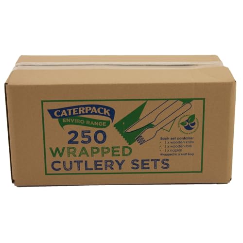 Caterpack Enviro Range Wrapped Cutlery Sets, Made from Sustainably Sourced Birchwood, Compostable and Biodegradable, Each Set Contains Knife, Fork and Napkin, 250 Pack