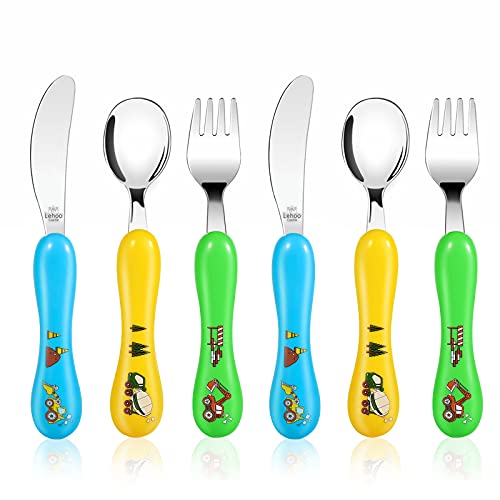 Lehoo Castle Toddler Kids Cutlery Set, 6 Pcs Stainless Steel Travel Camping Baby Cutlery Sets - 2 x Forks, 2 x Spoons, 2 x Knives, Children's Dinner Knife and Fork Sets (Construction Vehicles)