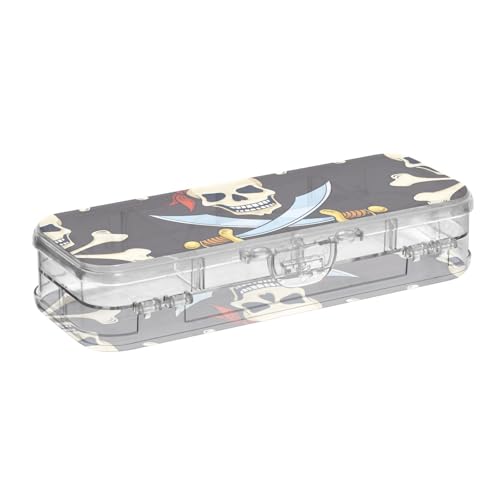 ISAOA Pencil Case Pirate Skull Knife Bone Pirate Pencils Box with Snap Lid,Double Deck Clear Stationery Pen Case with 4 Rulers Dividing Pen Storage Organiser for School Office
