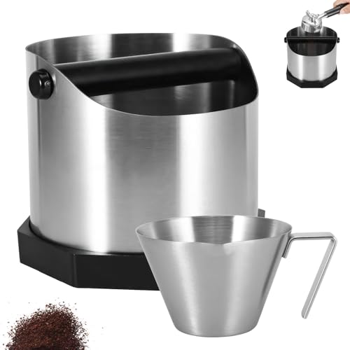 Coffee Knock Box - 1.6L Knock Box and Espresso Shot Measuring Cup, Coffee Grounds Knock Box with Removable Knock Bar and Non-Slip Base, Shock-Absorbent Espresso Knock Box Coffee Grounds Bin (Silver)