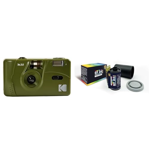KODAK M35 DA00254 - Rechargeable Camera 35mm, Fixed Wide-Angle Lens, Optical Viewfinder, Built-in Flash, AAA Battery – Olive Green + GT PHOTO Color Retro Film 35mm - 24 Exposures
