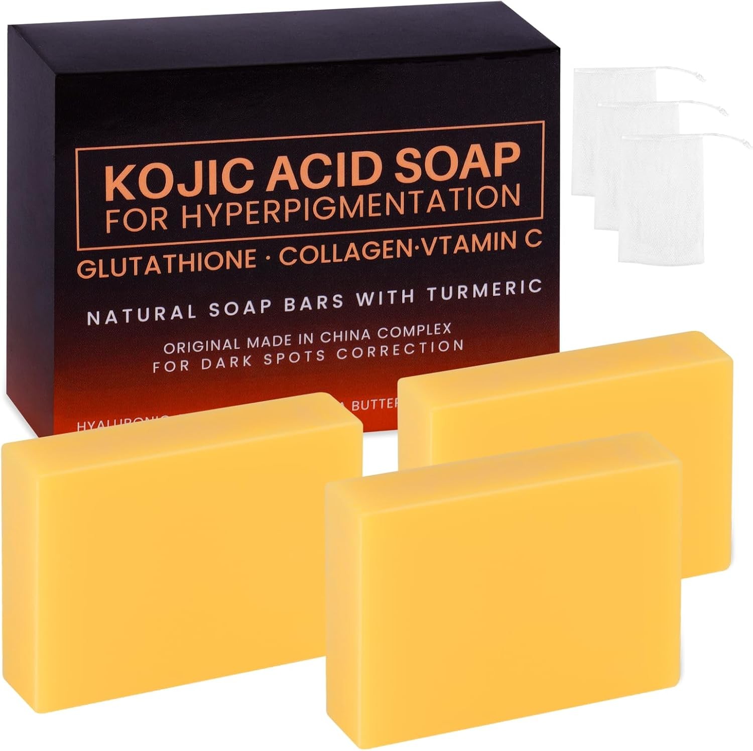 Kojic Acid Soap, with Turmeric & Vitamins C, Dark Spot Remover for Face and Body, 100g x3 Moisturizing for Acne Blackheads Remover, Hyaluronic Acid for Deep Cleansing, with a Mesh Pouch