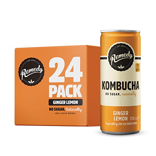Remedy Raw Kombucha Tea - Sparkling Live Cultured Drink - Sugar Free Ginger Lemon - 250ml Can (24 Pack)