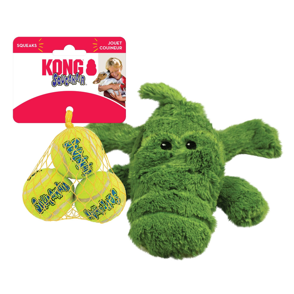 KONG Cozie Ali Alligator & SqueakAir Balls (3 Pack) - Dog Fetch & Chew Toys for Fun - Soft Toy Alligator for Indoor Play - Durable Dog Toy Balls for O