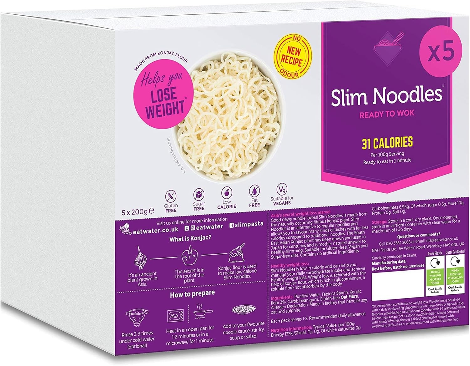 Eat Water Slim Noodles (Enviro Pack of 5 x 200g) Made from Konjac Flour, No Dra