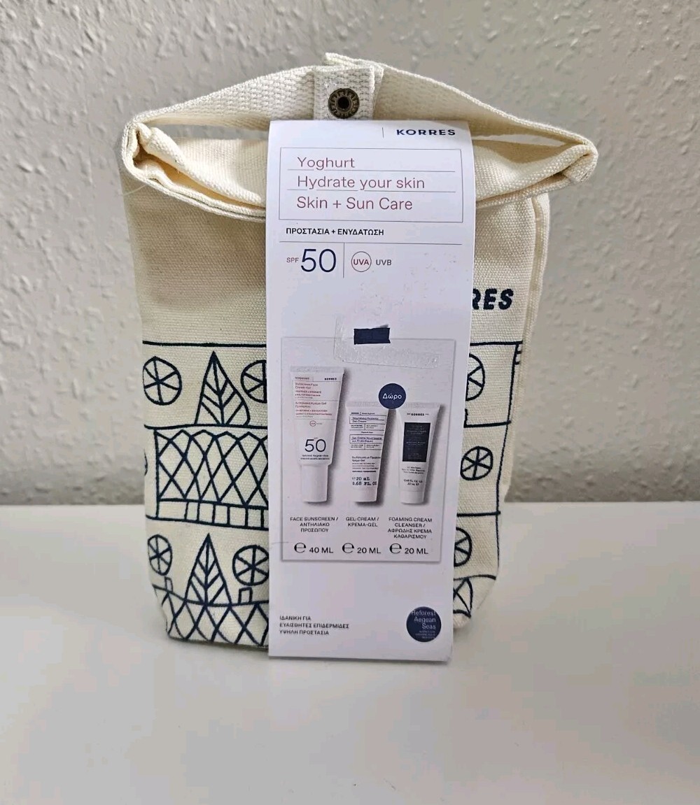 Korres Greek Yoghurt Sunscreen, Foaming Cream Cleanser and travel bag