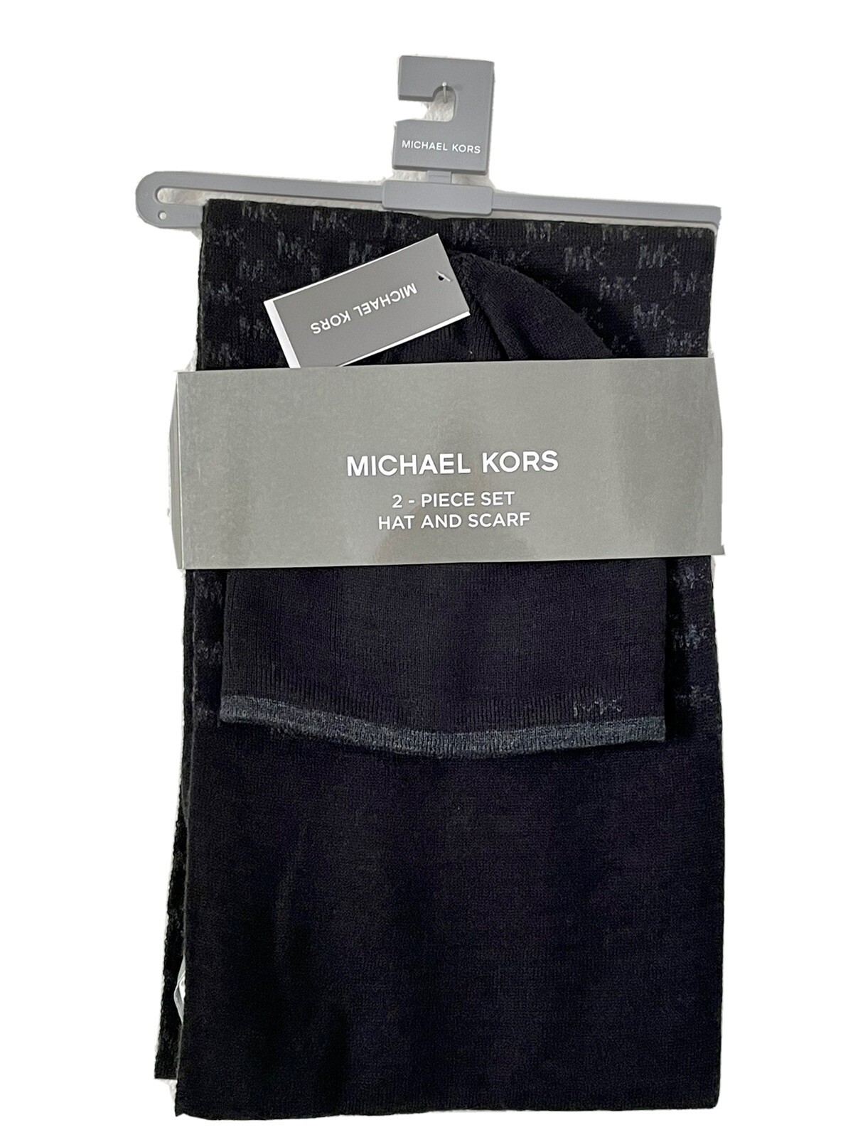 Michael Kors Hat & Scarf 2-Piece Set Black/Grey Twill Logo Monogram NEW