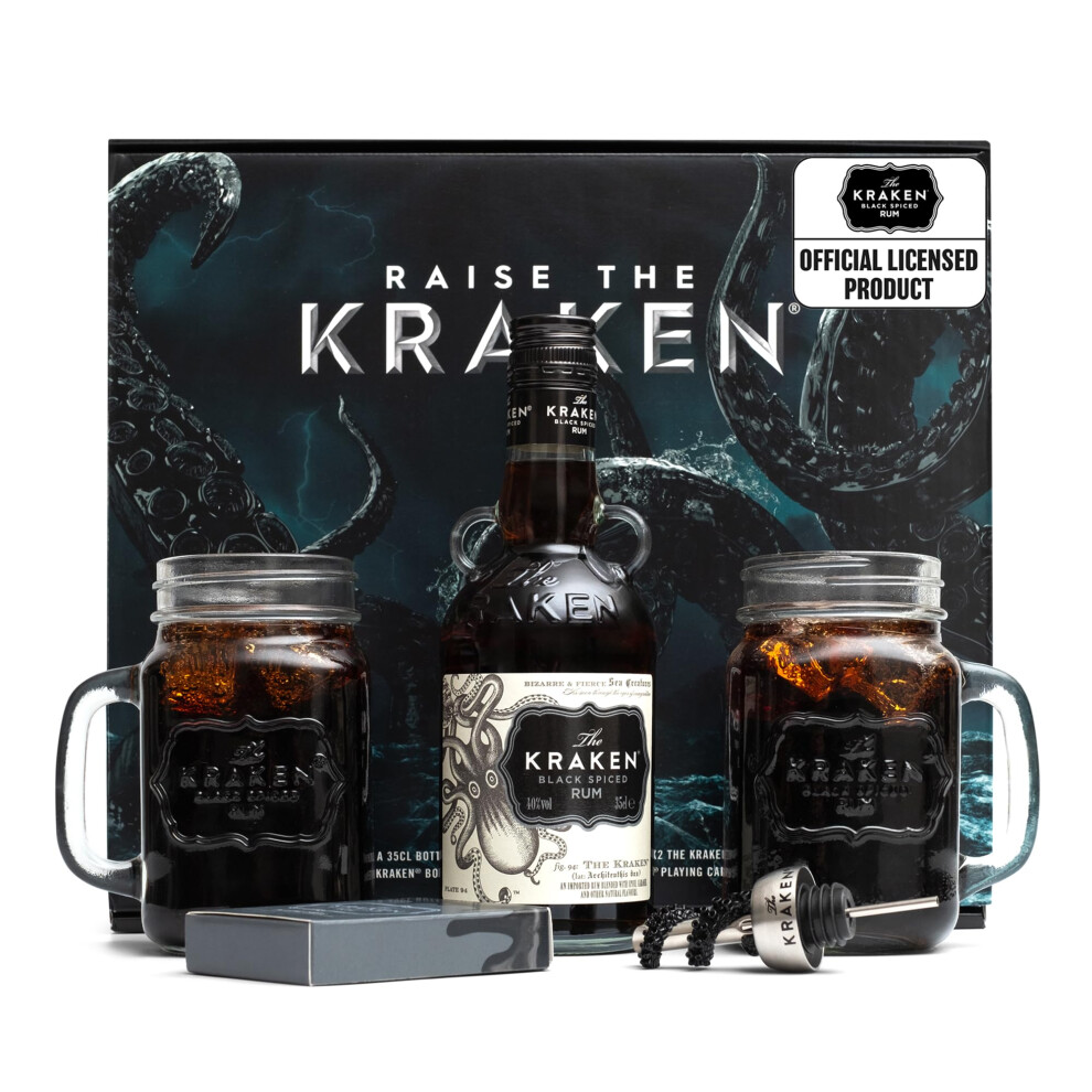 The Kraken Spiced Rum Gift Set - 35cl Official Kraken Black Spiced, 2x Mason Jar Glasses, Bottle Pourer, Playing Cards - Cocktail Rum Gifts for Men,