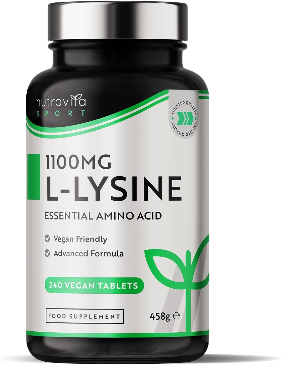 L-Lysine 1100mg High Strength - 240 Vegan & Gluten Free Tablets (8 Month Supply) - Cold Sore Treatment, Essential Amino Acid Supplement - Normal Growth and Muscle Turnover - Made in The UK - Nutravita