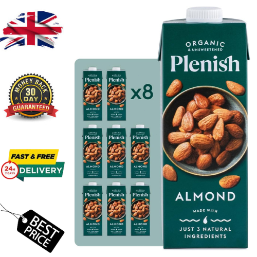 Plenish Unsweetened Organic Almond Milk 1L (Pack of 8)