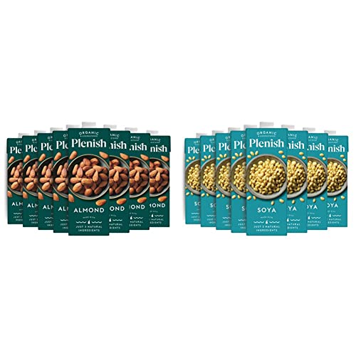 Plenish Unsweetened Organic Almond Milk 1L (8x 1Litre) & Soya Milk Drink| 8 x 1 Litre | Vegan, Organic, Unsweetened