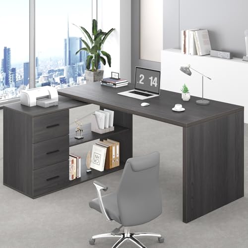 HSH L Shaped Computer Desk with Drawers, L Shaped Desk with Storage Cabinet Shelves, Large Reversible Corner Executive Home Office Desk, Industrial Wood Work Writing Study Table Workstation,Gray 60 In