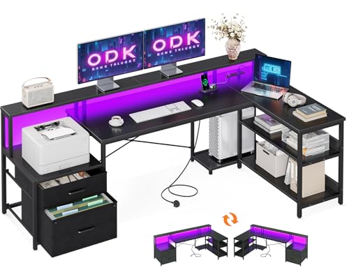 ODK Corner Desk with Drawers, L Shaped Gaming Desk with LED Lights & Power Outlets, Reversible Computer Desk for Home Office Workstation, Office Desks with Monitor Shelf, 135×110 cm, Black